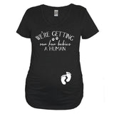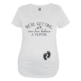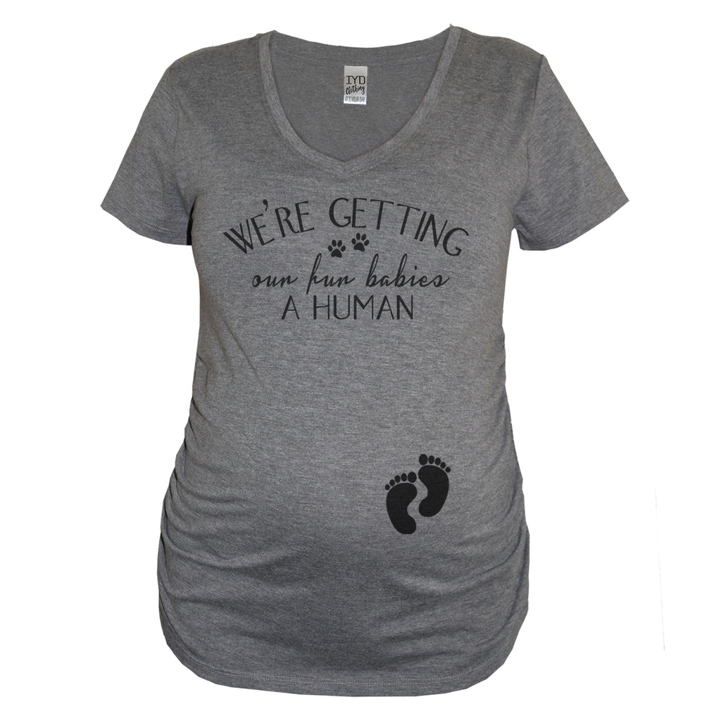 Your choice of a heather gray, black, or white women's very soft and comfortable maternity v neck with "We're Getting Our Fur Babies A Human" and baby feet print in black (white print on the black shirt). Makes for a fun Pregnancy Reveal or photo op!