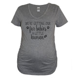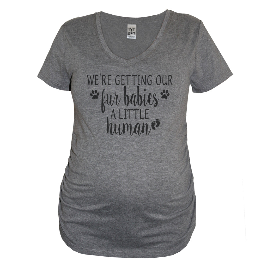 Your choice of a heather gray, black, or white women's very soft and comfortable maternity v neck with "We're Getting Our Fur Babies A Little Human" print in black (white print on the black shirt). Makes for a fun Pregnancy Reveal or photo op!