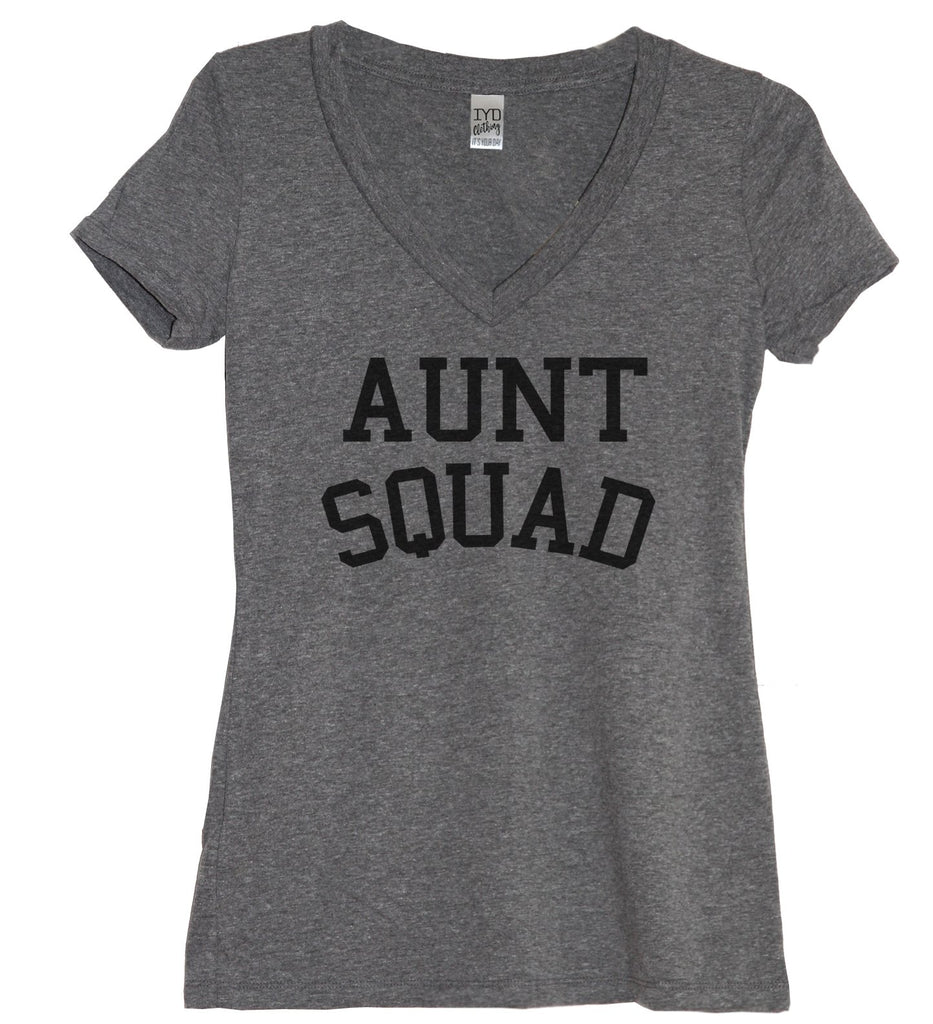 Let everyone know what squad your a part of with this heather gray women's very soft and comfortable fitted v-neck tee with "Aunt Squad" print in black.