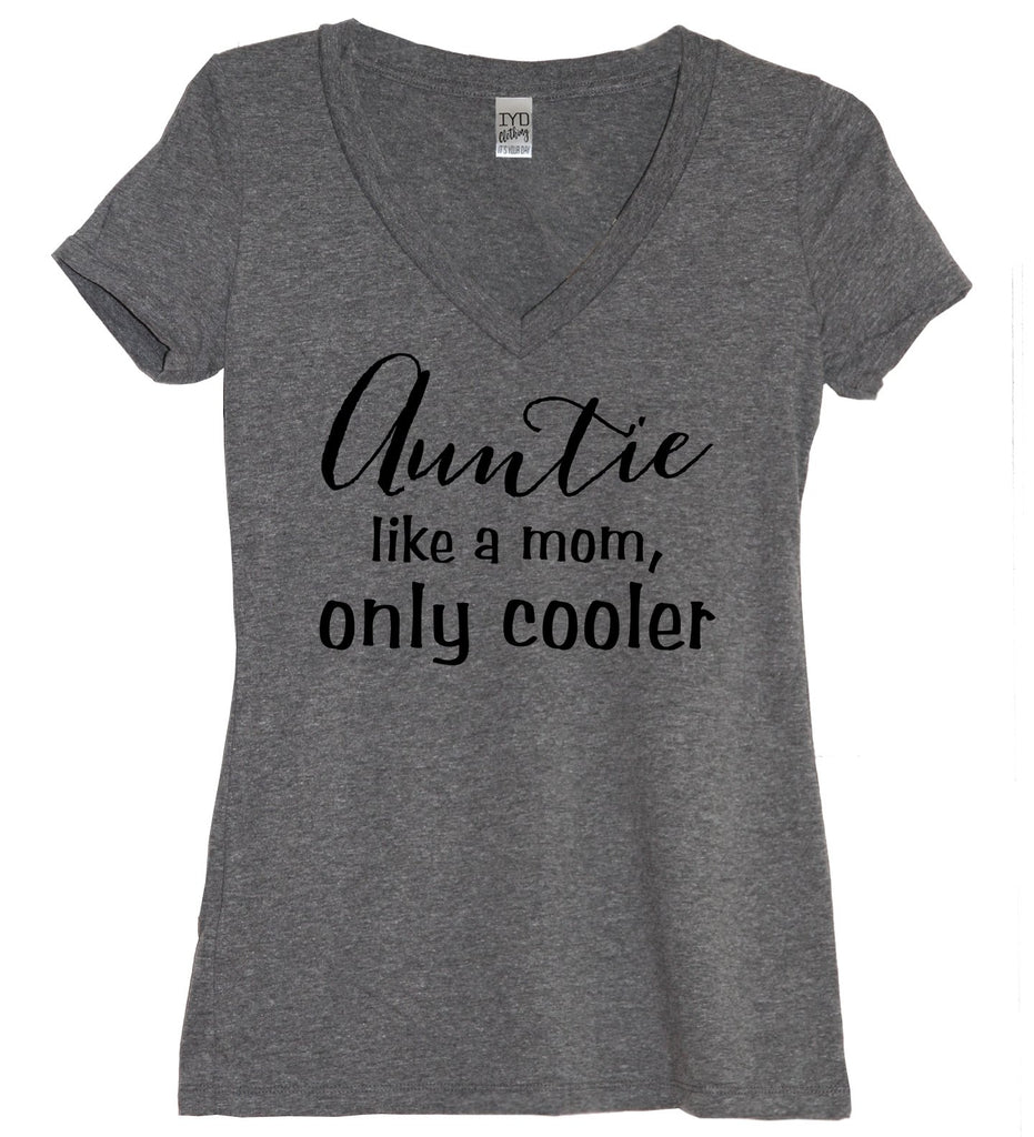 Love spoiling your niece/nephew? Let everyone know you are the coolest with this heather gray women's very soft and comfortable fitted v-neck tee with "Auntie Like A Mom, Only Cooler" print in black.