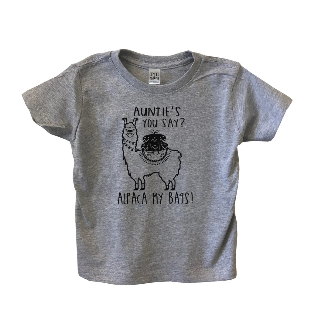 Your little will be ready for Auntie's house with this crew neck heather gray toddler sized shirt with "Auntie's You Say Alpaca My Bags" and cute Alpaca print in black. Makes a great Aunt gift!