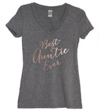 Show off your Auntie pride or makes a great gift for a new Auntie! A heather gray women's very soft and comfortable fitted v-neck tee with metallic rose gold "Best Auntie Ever" print.