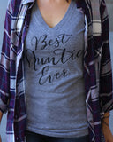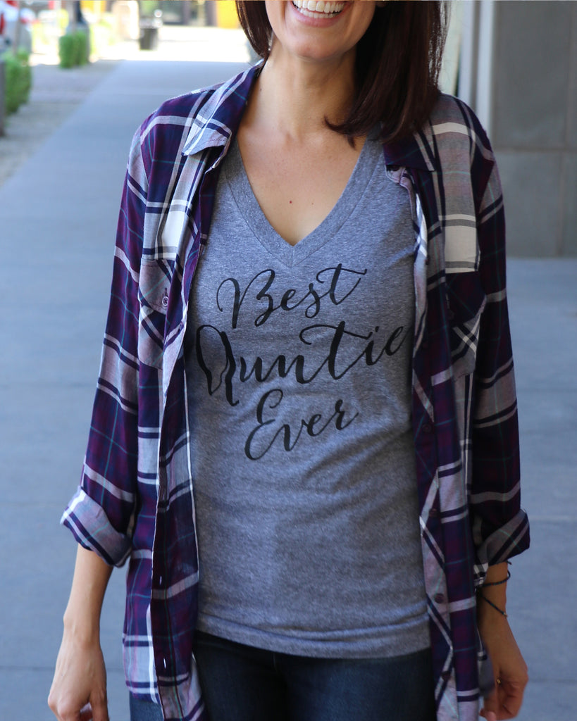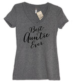 Show off your Auntie pride or makes a great gift for a new Auntie! A heather gray women's very soft and comfortable fitted v-neck tee with black "Best Auntie Ever" print.