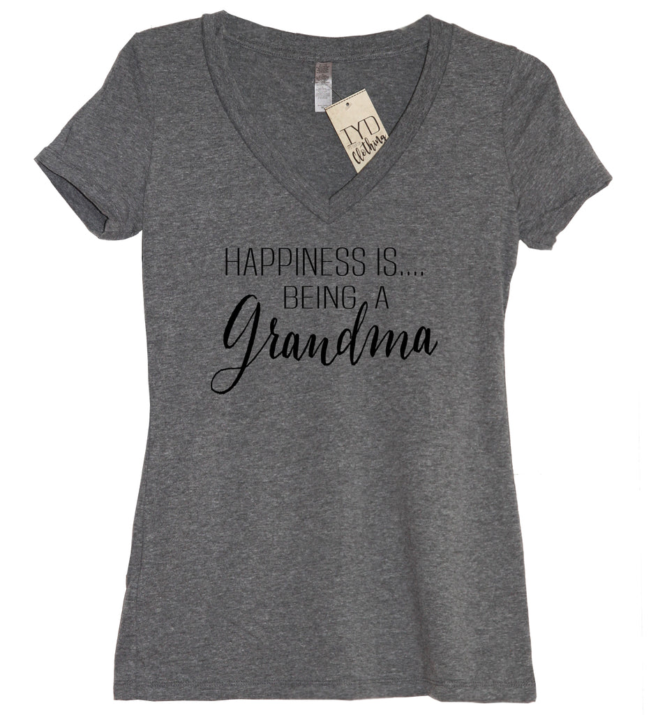 When you think about your happiness is it your grand kids? Show off your Grandma pride or makes a great gift for a new or Grandma to be. A heather gray women's very soft and comfortable fitted v-neck tee with "Happiness Is Being A Grandma" print in black.