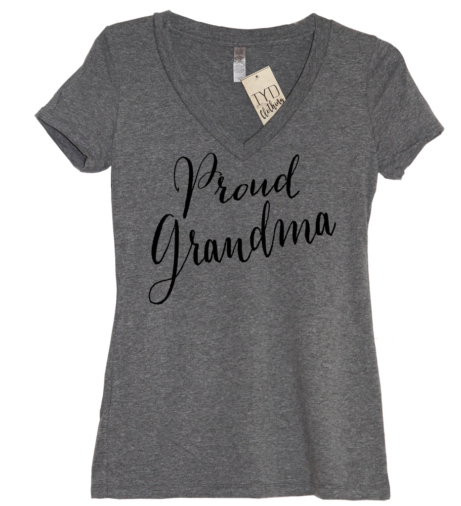 Grandmas are the best! Show off your Grandma pride or makes a great gift for a new or Grandma to be. A heather gray women's very soft and comfortable fitted v-neck tee with black "Proud Grandma" print.