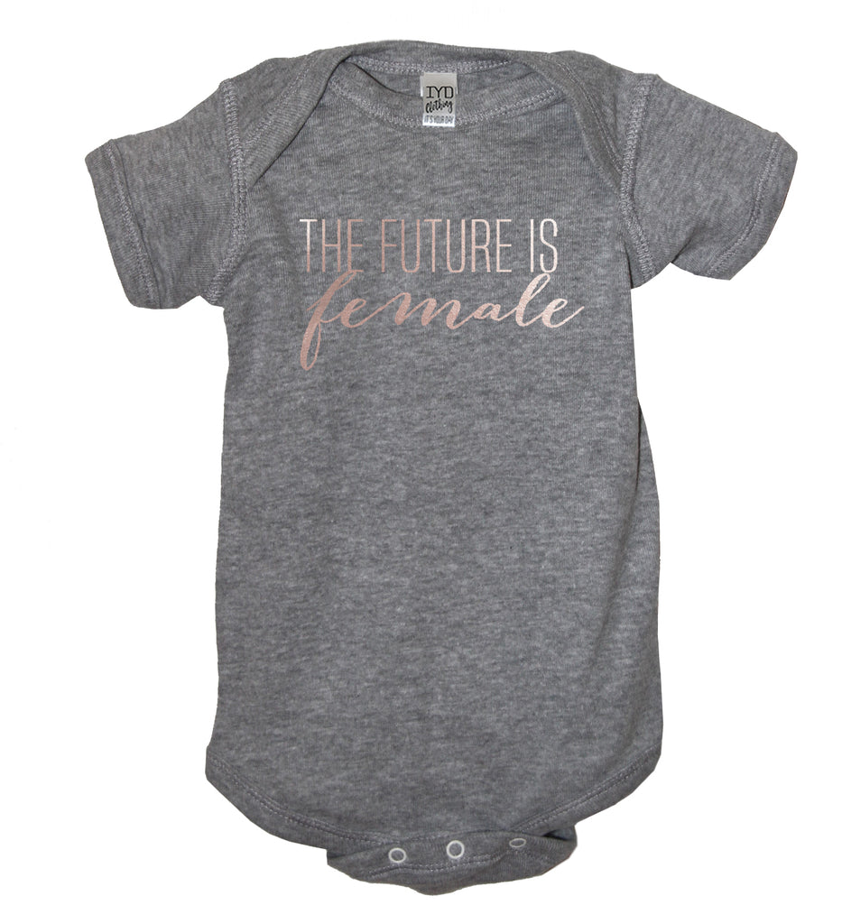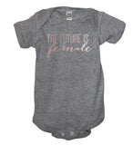 Let the world know what the future will be like with this heather gray bodysuit with "The Future Is Female" print in metallic rose gold. Makes a great gift!