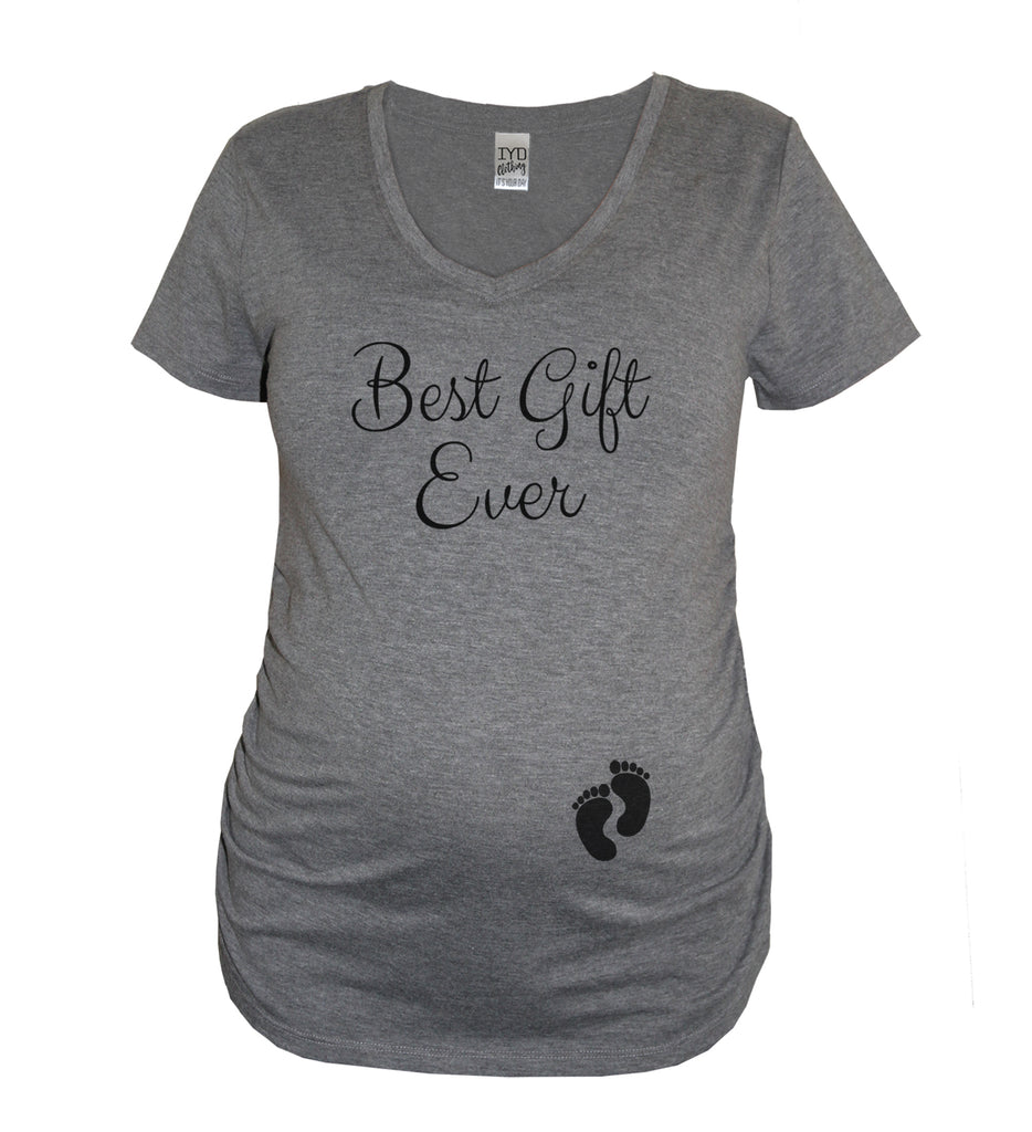 Are you expecting the best gift ever? Let everyone know with this heather gray women's very soft and comfortable maternity style fitted v-neck tee with ruched sides and "Best Gift Ever" and baby feet print in black. Great for pregnancy announcements!