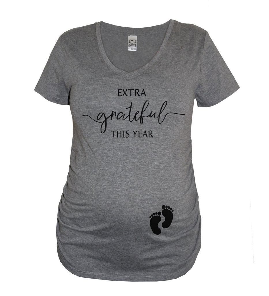 Are you expecting? Let everyone know with this heather gray women's very soft and comfortable maternity style fitted v-neck tee with ruched sides with "Extra Grateful This Year" and baby feet print in black. Great for pregnancy announcements!