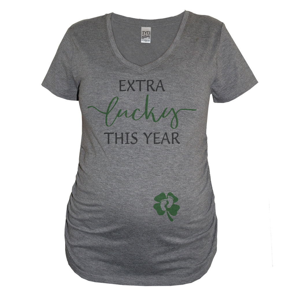 Your choice of a white or heather gray women's very soft and comfortable  maternity v neck with "Extra (black) Lucky (green) This Year (black)" and green clover and baby feet on the belly area . A fun way to announce your pregnancy on St Patrick's Day!