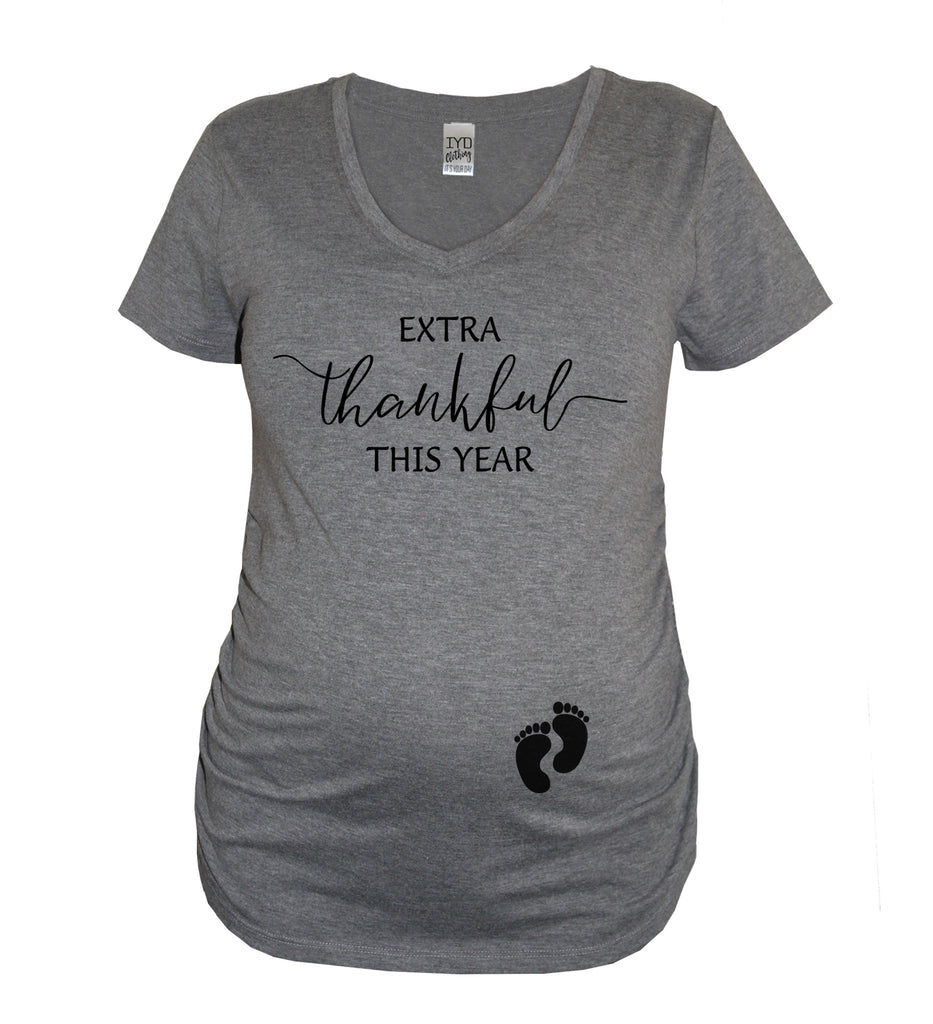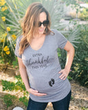 Are you expecting? Let everyone know with this heather gray women's very soft and comfortable maternity style fitted v-neck tee with ruched sides with "Extra Thankful This Year" and baby feet print in black. Great for pregnancy announcements!