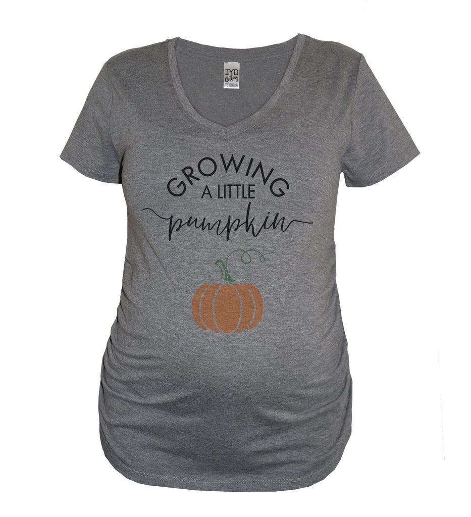Are you expecting? Let everyone know with this heather gray women's very soft and comfortable maternity style fitted v-neck tee with ruched sides with "Growing A Little Pumpkin" and Pumpkin print on belly. Great for Fall pregnancy announcements!