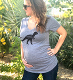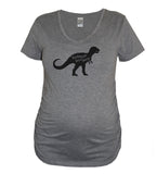Is your growing belly starting to make you feel as big as a dinosaur? Let everyone know with this heather gray women's very soft and comfortable fitted maternity style v-neck tee with ruched sides and "Mamasaurus" and T Rex print in black. Great for pregnancy announcements!
