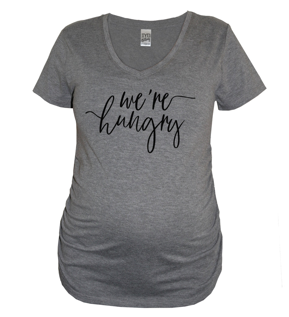 Is there a little secret you would like people to know? Let everyone know with this heather gray women's very soft and comfortable fitted maternity style v-neck tee with ruched sides and "We're Hungry" print in black. Great for pregnancy announcements!