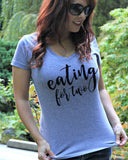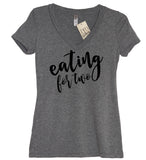 Is there a little secret you would like people to know? Let everyone know with this heather gray women's very soft and comfortable fitted v-neck tee with black "Eating For Two" print. Great for a pregnancy announcement or a gift. *Please note, this is NOT A MATERNITY SHIRT.