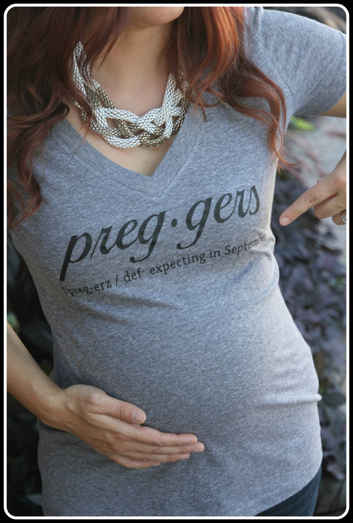 Expecting a little one? Let everyone know with this heather gray women's very soft and comfortable fitted v-neck tee with black "Preggers Def: Expecting In _Select Due Date Month_" print. Great for maternity announcements! *Please note, this is not a maternity shirt.