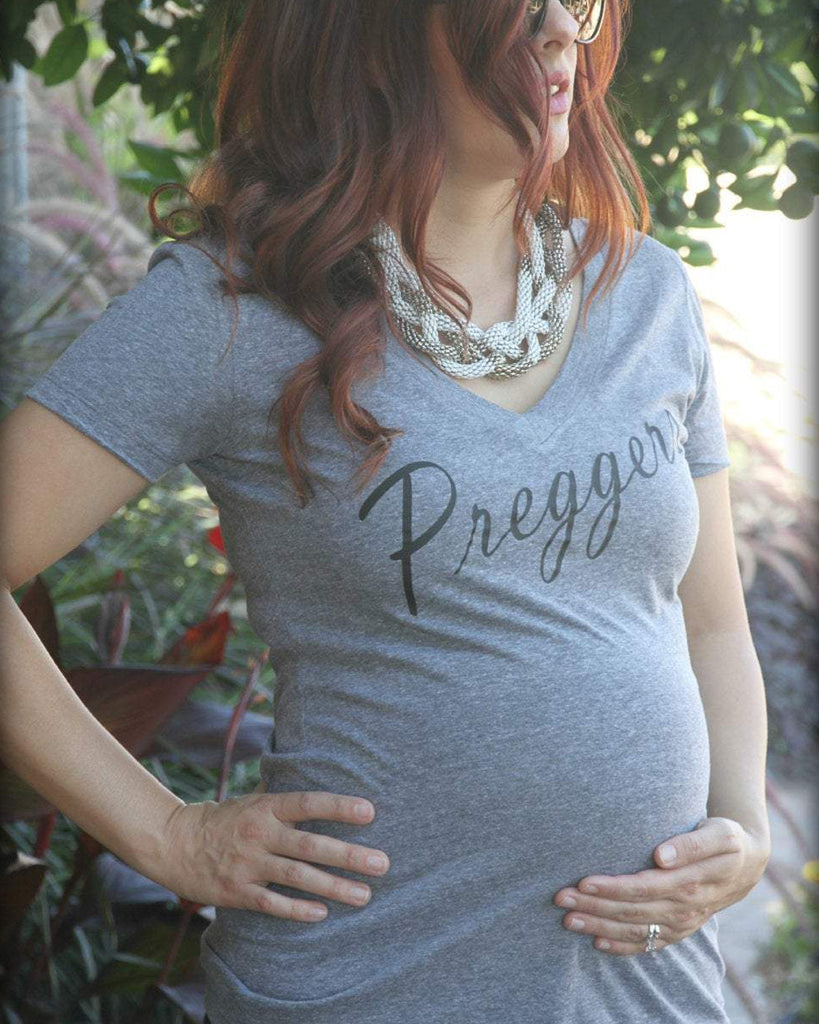 Expecting a little one? Let everyone know with this heather gray women's very soft and comfortable fitted v-neck tee with black "Preggers" print. Great for maternity announcements! *Please note, this is not a maternity shirt.