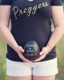 Expecting a little one? Let everyone know with this black women's very soft and comfortable fitted v-neck tee with gold glitter "Preggers" print. Great for maternity announcements! *Please note, this is NOT A MATERNITY SHIRT.