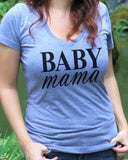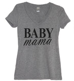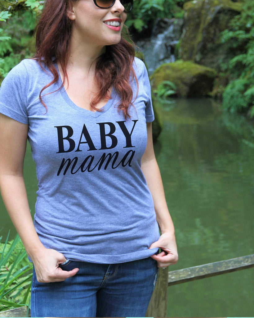 Ain't no drama over here! Let everyone know who you are with this heather gray women's very soft and comfortable fitted v-neck tee with black "Baby Mama" print. Great for a pregnancy announcement or a gift. *Please note, this is not a maternity shirt.
