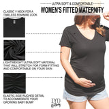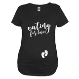 Is there a little secret you would like people to know? Let everyone know with this soft and comfortable black maternity v neck shirt with "Eating For Two" in white print with baby feet on the belly area and black crew neck with "Drinking For Two" in white print. Makes a great gift!