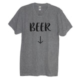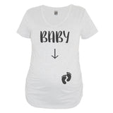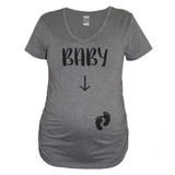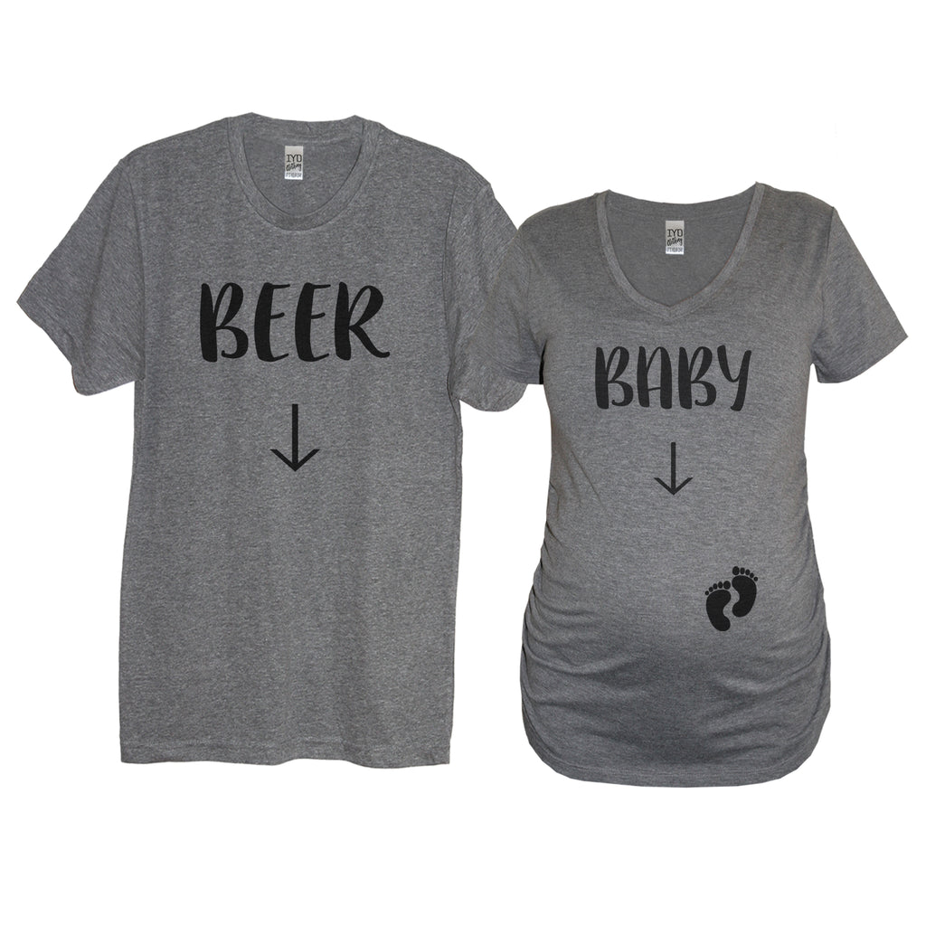 Expecting this holiday season? Let everyone know with a heather gray soft and comfortable men's crew neck shirt with "Beer" print and a white or heather gray maternity women's fitted style v neck shirt with ruched sides shirt with "Baby" and baby feet print on the belly area. Both shirts come with arrows pointing to the bellies. Perfect to announce your pregnancy!