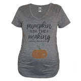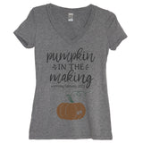 Are you expecting? Let everyone know with this women's heather gray or white very soft and comfortable regular v neck shirt or maternity style fitted v neck tee with ruched sides with "Pumpkin In The Making / Arriving [Custom Month And Year]" and Pumpkin print on belly. Great for Fall pregnancy announcements!