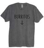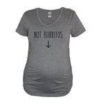 Do you love Mexican food and have a little secret you would like people to know? A heather gray soft and comfortable mens crew neck shirt with "Burritos" and arrow print in black and a maternity women's fitted style v neck shirt with ruched sides shirt with "Not Burritos" and arrow print in black. Makes a great pregnancy announcement!