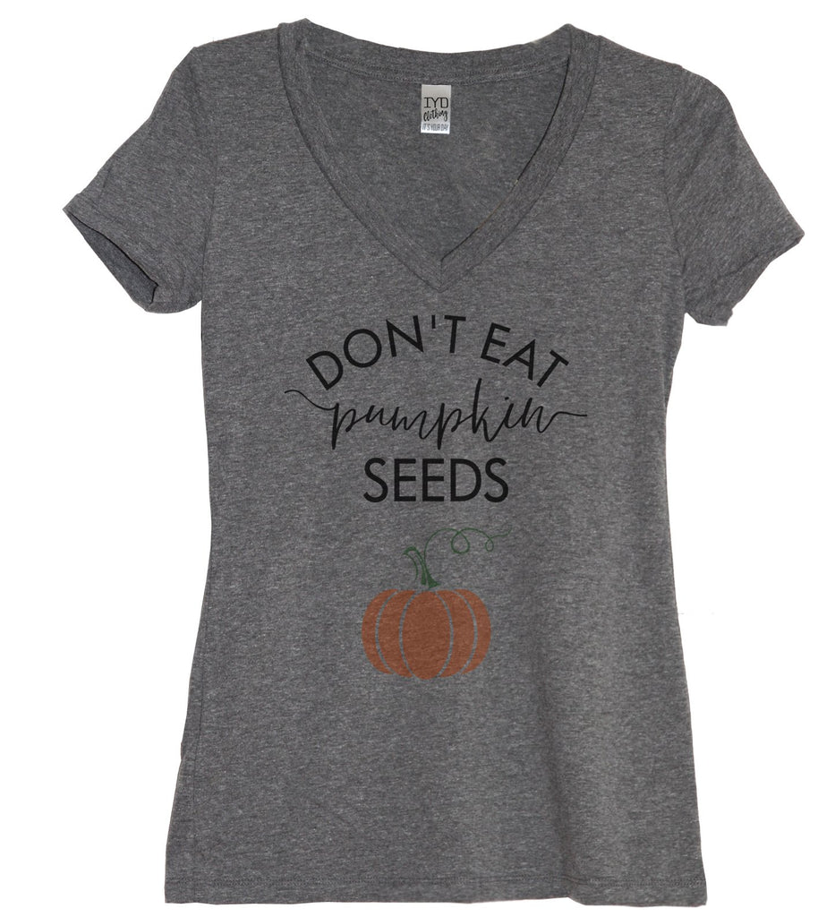 Is there a little secret you would like people to know? Let everyone know with this heather gray women's very soft and comfortable fitted v-neck tee with black "Don't Eat Pumpkin Seeds" and pumpkin on belly area print. Great for a pregnancy announcement or a gift. *Please note, this is NOT A MATERNITY SHIRT.