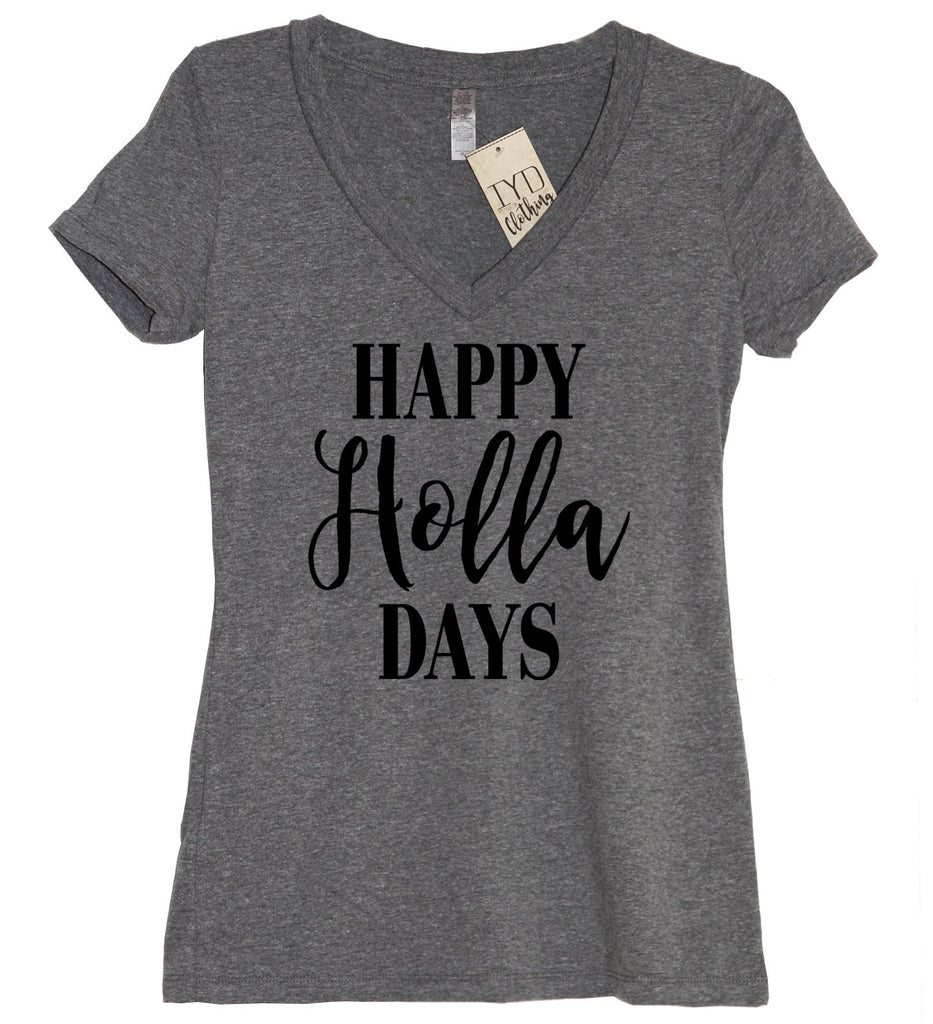 Are you happy that its time for the "holla" days? Let everyone know with this heather gray women's very soft and comfortable fitted v-neck tee with black "Happy Holla Days" print. Makes a great gift!