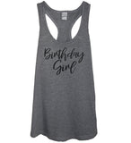 Happy Birthday to you! Let everyone know who's special day it is with this heather gray women's very soft and comfortable racerback tank with black "Birthday Girl" print.