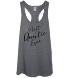 Show off your Auntie pride or makes a great gift for a new Auntie! A heather gray women's very soft and comfortable racerback tank with black "Best Auntie Ever" print.