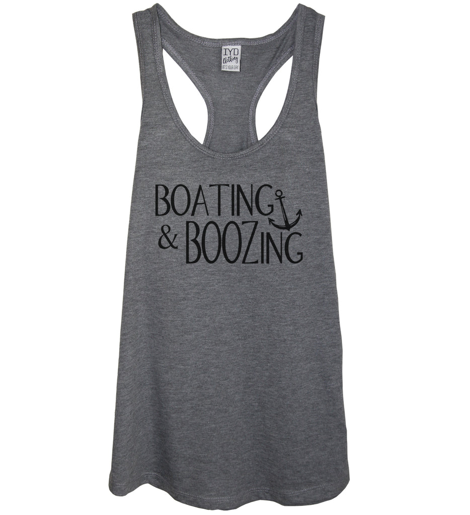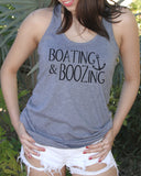 A heather gray very soft and comfortable racerback tank with "Boating & Boozing" print in black.