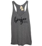 Love your rose', weekend brunch, and your Louie? Then let everyone know what kind of girl you are with this heather gray women's very soft and comfortable racerback tank with "Boujee Girl" print in black.