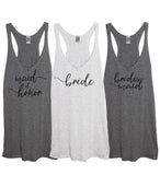 Let everyone know who's who in your bridal party with your choice of a heather white women's very soft and comfortable racer back tank with "bride" or a heather gray women's very soft and comfortable racer back tank with"maid of honor" or "bridemaid" print in black. Perfect to wear while getting ready on your wedding day or for the bachelorette party! *Please note this is for (1) tank top
