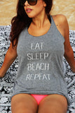Lounge on the beach with a heather gray women's very soft and comfortable racer back tank with a white "Eat Sleep Beach Repeat" print.