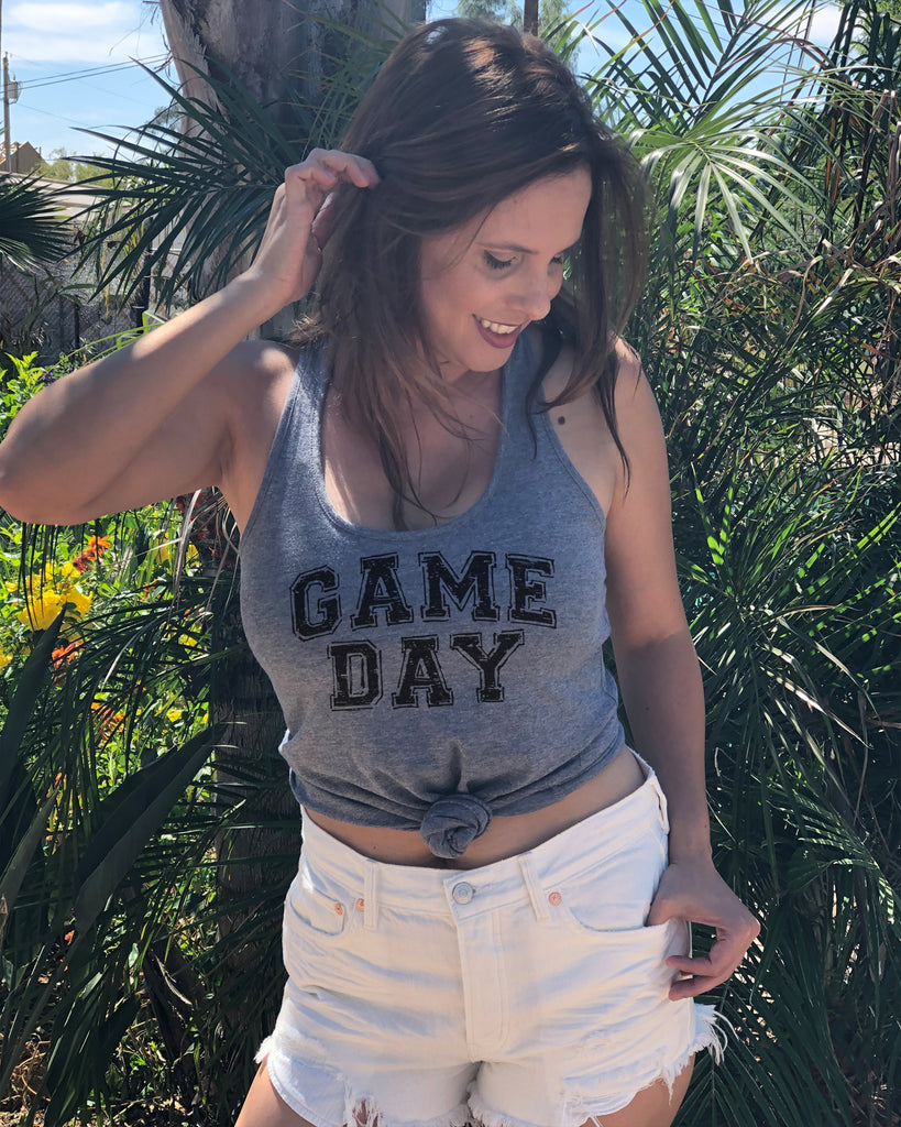 Get ready for the big game with this heather gray women's very soft and comfortable racerback tank with "Game Day" print in black.