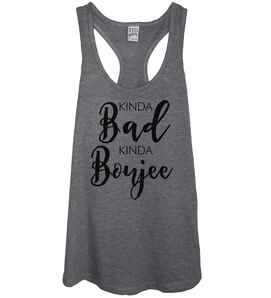 Are you high class and you know it girl? Let everyone know with this with this heather gray women's very soft and comfortable racerback tank with "Kinda Bad Kinda Boujee" print in black.