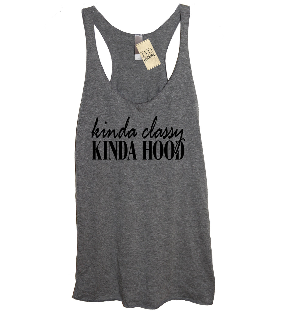 Can you go from lady to ghetto in 10 seconds? Listen to Tupac on your way home from spin? Let everyone know with this with this heather gray women's very soft and comfortable racerback tank with "Kinda Classy Kinda Hood" print in black.