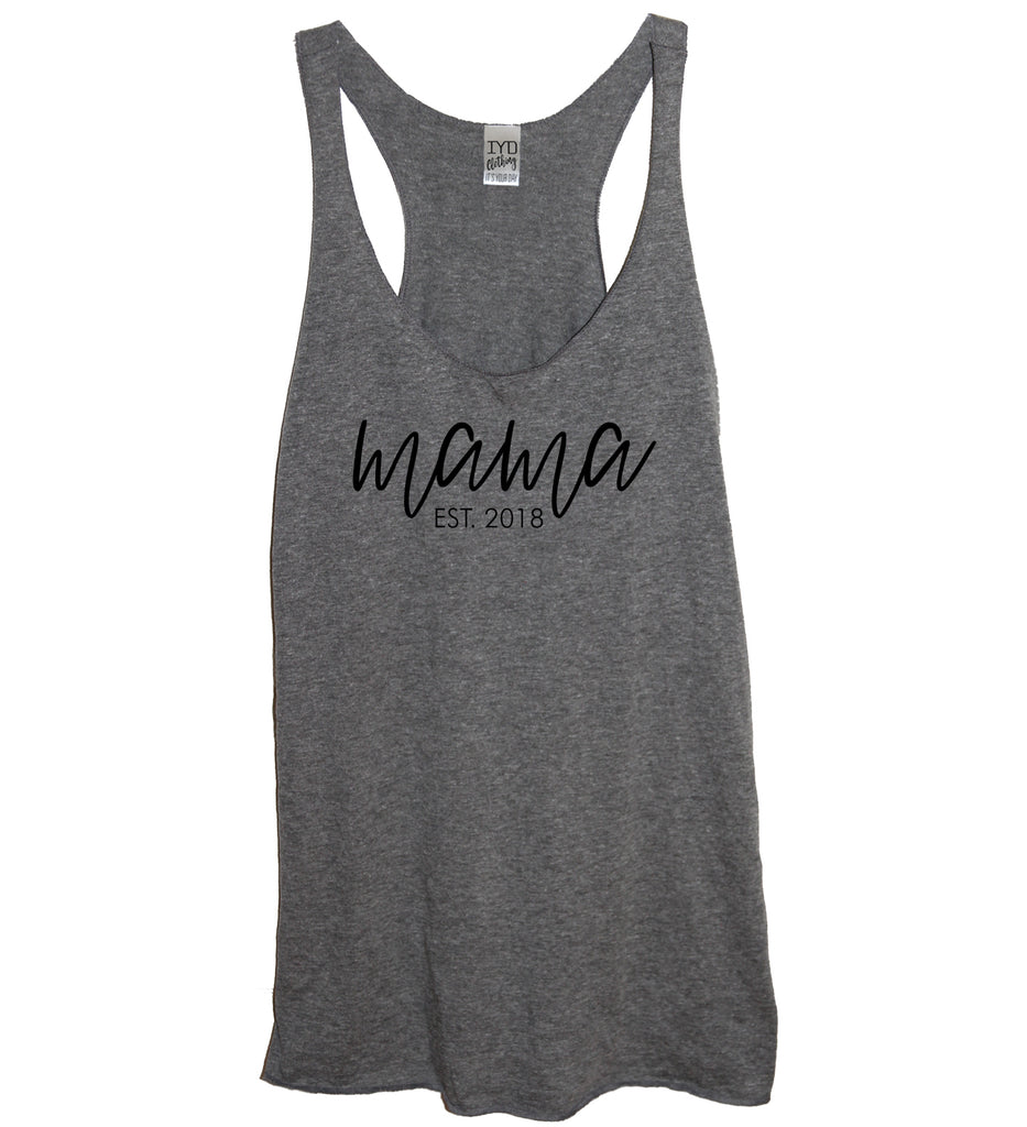 What year did you become a Mama? Let everyone know with this heather gray women's very soft and comfortable racer back tank with "Mama Est. _Year_" print in black.
