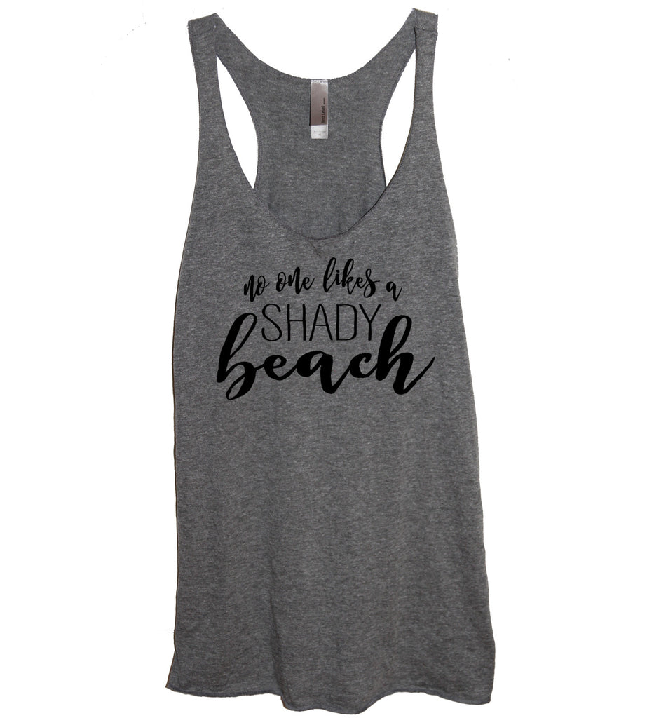 Remind everyone no one likes a shady beach with this heather gray women's very soft and comfortable racer back tank with black "No One Likes A Shady Beach" print.