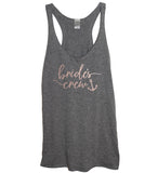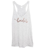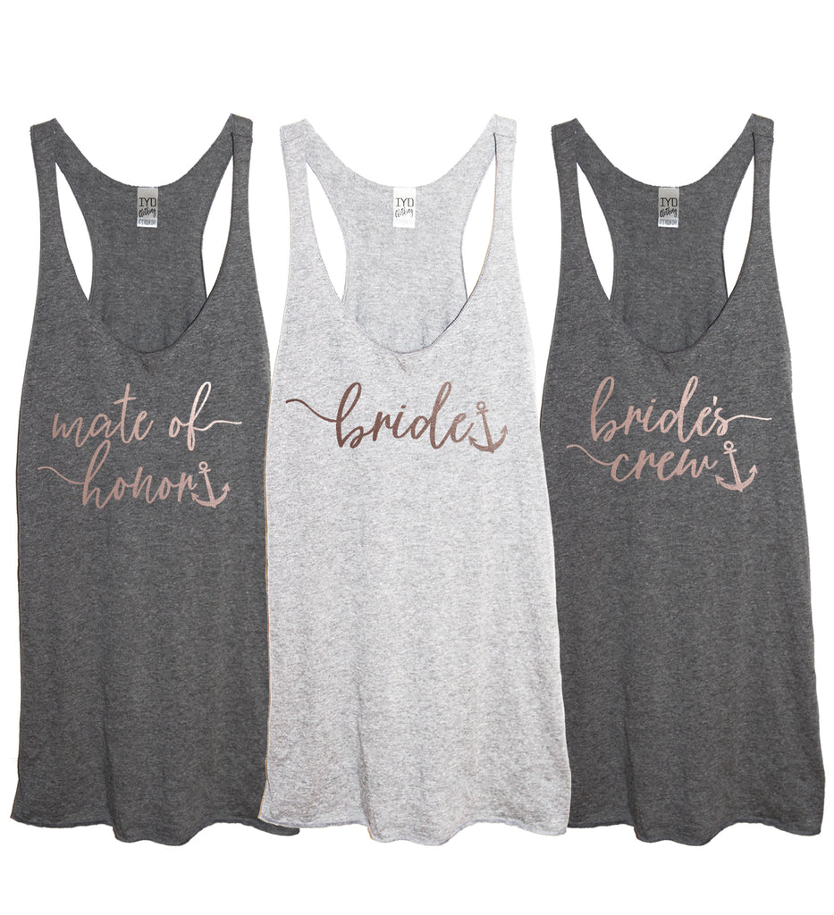 Having a nautical theme wedding? Let everyone know who's who in your bridal party with your choice of a heather white or heather gray women's very soft and comfortable racer back tank with "bride", "mate of honor", or "brides crew" and anchor print in metallic rose gold. Perfect to wear while getting ready on your wedding day or for the bachelorette party! *Please note this is for (1) tank top