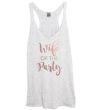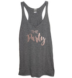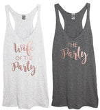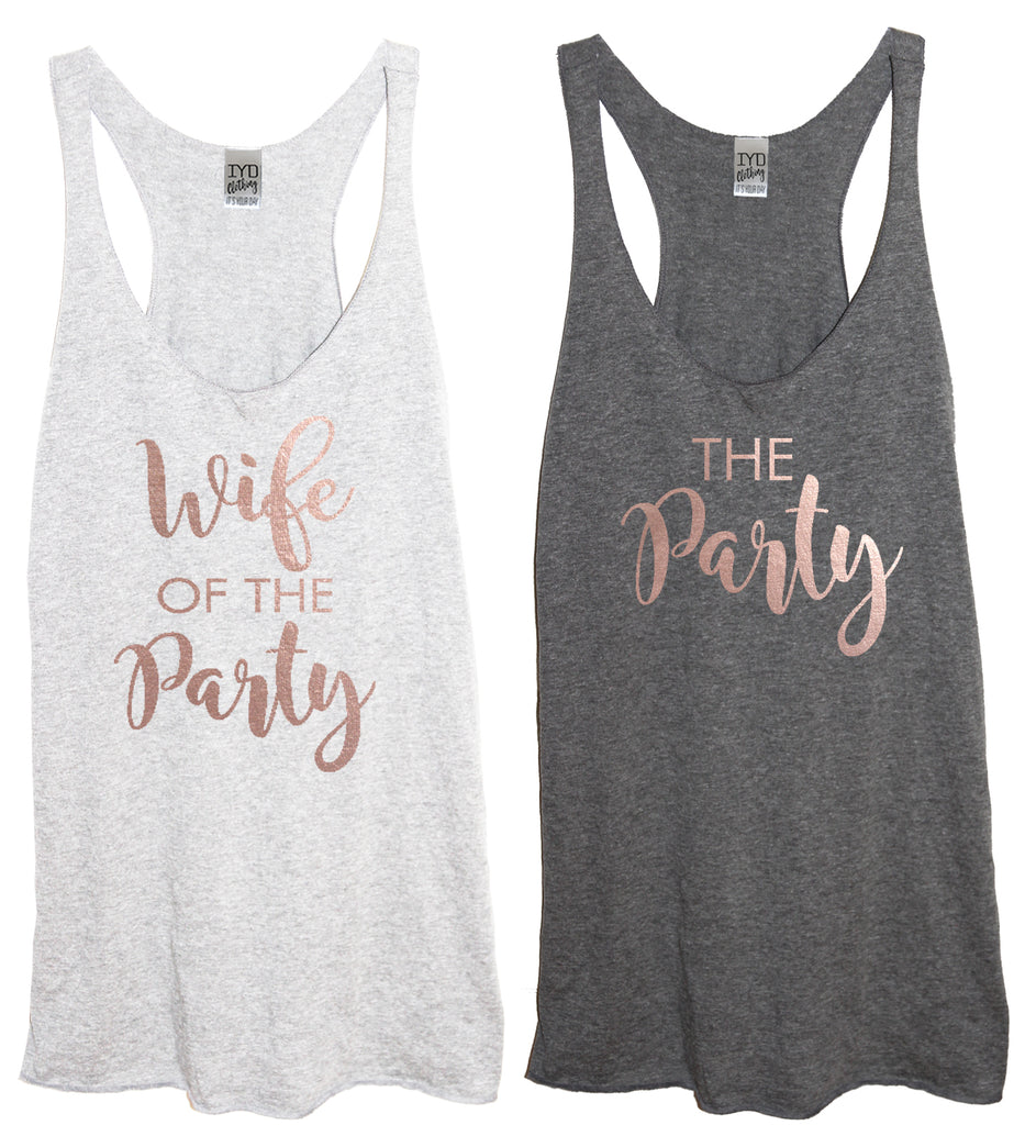 You are your girls will be ready to party with your choice of a heather white women's very soft and comfortable racer back tank with "Wife Of The Party" or heather gray women's very soft and comfortable racer back tank with "The Party" print in metallic rose gold. Perfect to wear while getting ready on your wedding day or for the bachelorette party! *Please note this is for (1) tank top