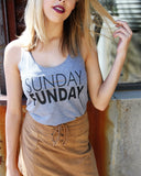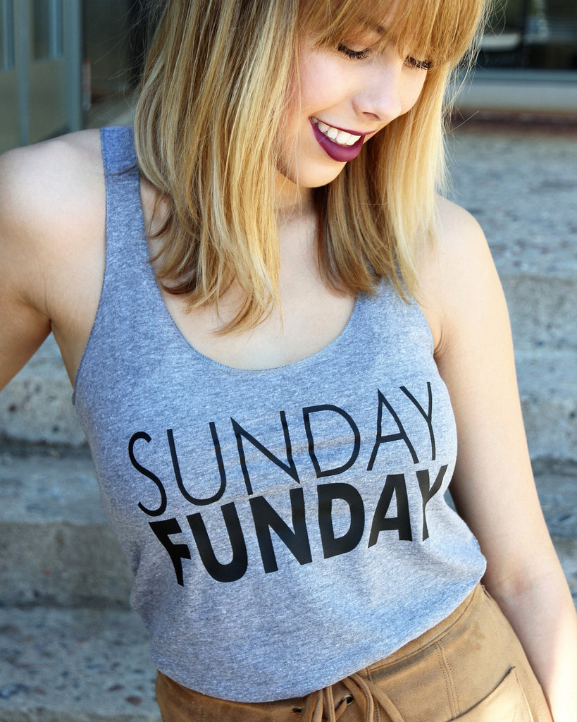 Make Sunday your funday! A heather gray women's very soft and comfortable racer back tank with black "Sunday Funday" print.