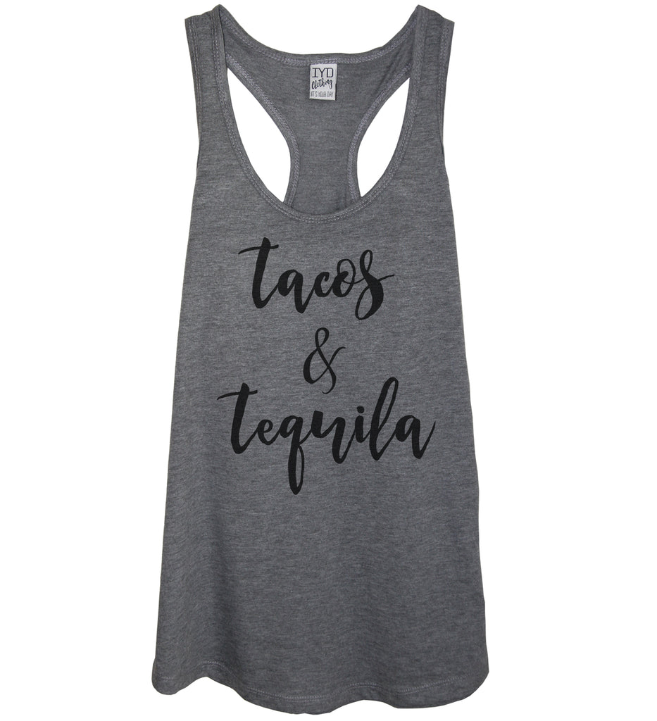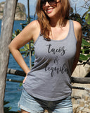 Two important things you need either for your vacation or taco Tuesday! A heather gray women's very soft and comfortable racerback tank with "Tacos & Tequila" print in black.