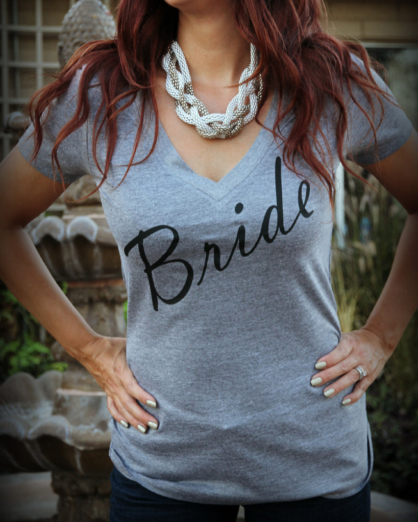 Are you the bride to be? Let everyone know who your bridal party is with this heather gray women's very soft and comfortable fitted v-neck tee with black "Bride" or "Bridesmaid" print. Great for wearing the day of getting ready or your bachelorette party.
