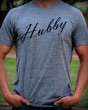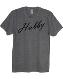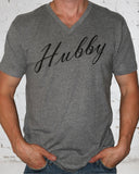 A heather gray men's very soft and comfortable tee with black "Hubby" print. Available in crew neck or v neck.