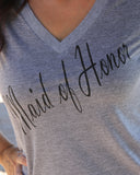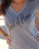 Are you the bride to be? Let everyone know who your bridal party is with this heather gray women's very soft and comfortable fitted v-neck tee with black "Maid of Honor" print. Great for wearing the day of getting ready or your bachelorette party.