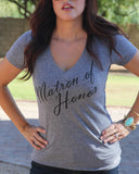 Let everyone know who your bridal party is with this heather gray women's very soft and comfortable fitted v-neck tee with black "Matron of Honor" or your choice of print. Great for wearing the day of getting ready or your bachelorette party.