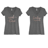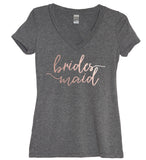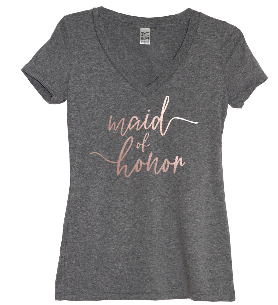 Let everyone know who's who in your bridal party with this heather gray women's very soft and comfortable fitted v-neck tee with your choice of "maid of honor" or "bridesmaid" print in metallic rose gold. Great for wearing the day of getting ready or your bachelorette party. *Please note this is for (1) shirt