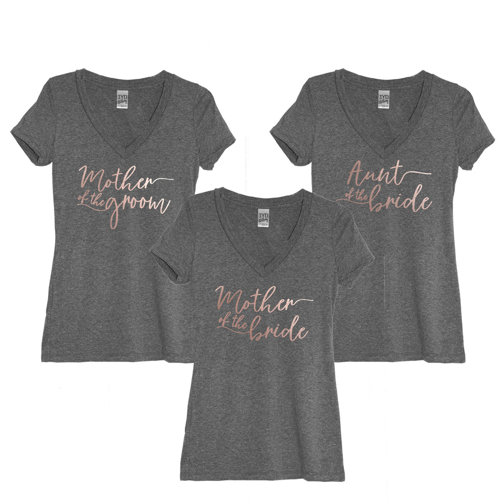 Let everyone know who's who in your bridal party with this heather gray women's very soft and comfortable fitted v-neck tee with your choice of "mother of the groom", "mother of the bride", or "aunt of the bride" print in metallic rose gold. Great for wearing the day of getting ready or your bachelorette party. *Please note this is for (1) shirt