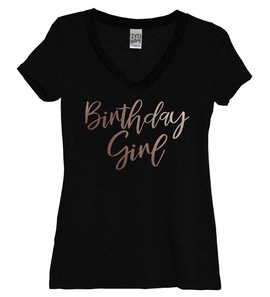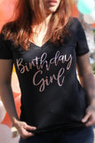 Who's the birthday girl? Let everyone know who's special day it is with this black women's fitted v-neck tee with "Birthday Girl" print in metallic rose gold. Makes a great gift!